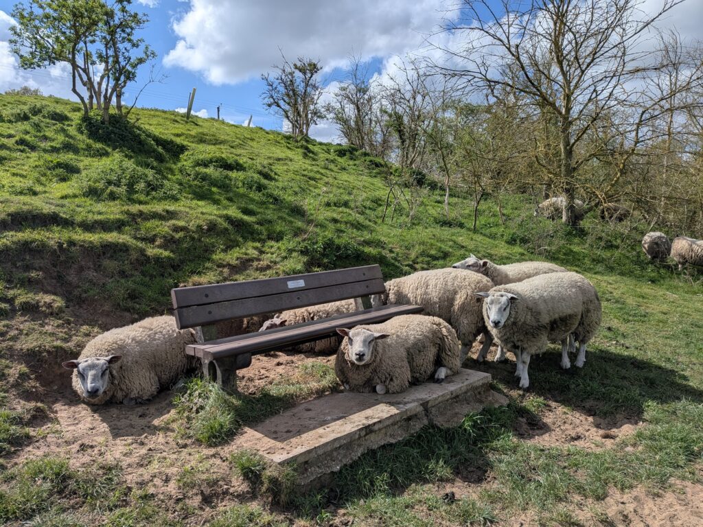 I ran down to parkrun on Saturday, early enough to tag along with the course inspection again, then stopped off at the Cricketers (again) with the gang for a second breakfast. Then on Sunday I went out for a few miles in the sunshine round the Fynn Valley. No sign of my friendly sheep, but its friends seem to have taken over the bench in the field.